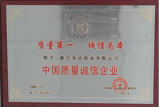 “中國(guó)質(zhì)量誠(chéng)信企業(yè)”是中國(guó)出入境檢驗(yàn)檢疫協(xié)會(huì)為進(jìn)一步推動(dòng)質(zhì)量誠(chéng)信體系建設(shè)而設(shè)立的榮譽(yù)稱(chēng)號(hào)。也是中國(guó)出入境檢驗(yàn)檢疫協(xié)會(huì)發(fā)起的最具政府性、權(quán)威性的認(rèn)證服務(wù),評(píng)選企業(yè)須符合法定資質(zhì)、行政許可、強(qiáng)制性標(biāo)準(zhǔn)和強(qiáng)制性認(rèn)證等方面要求,必須是近三年內(nèi)無(wú)產(chǎn)品檢驗(yàn)檢疫不合格記錄以及海關(guān)、稅務(wù)部門(mén)、安全生產(chǎn)部門(mén)、質(zhì)量監(jiān)督部門(mén)無(wú)違紀(jì)等,擁有自主品牌且產(chǎn)品質(zhì)量在相關(guān)地區(qū)或同行業(yè)中處于領(lǐng)先地位,評(píng)比條件十分嚴(yán)苛。圣達(dá)公司是本次評(píng)獎(jiǎng)中,直接獲得殊榮的單位,臺(tái)州市醫(yī)化企業(yè)中唯一一家獲此榮譽(yù)的單位,也是天臺(tái)縣首家獲此殊榮的企業(yè)。