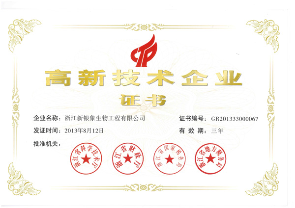 近年來,新銀象公司不斷在管理及研發(fā)上創(chuàng)新,推動天然食品防腐劑行業(yè)的發(fā)展,成功的獲得“高新技術(shù)企業(yè)”認定,是浙江省政府對我公司發(fā)展成績的支持和肯定,也是客戶和社會各界人士對我公司關(guān)心和支持的成果。“高新技術(shù)企業(yè)認定”證書的獲得,提高了公司知名度,增強了產(chǎn)品的市場競爭力,對開發(fā)國內(nèi)大客戶起到很好的實力宣傳作用,同時也對公司的發(fā)展提出了更高更遠的要求。今后,公司將著力從保護知識產(chǎn)權(quán),提升企業(yè)核心競爭力;加大科研投入,充實企業(yè)創(chuàng)新發(fā)展后勁;引入高素質(zhì)的人才隊伍,為自主創(chuàng)新提供根本保證等方面加強公司技術(shù)創(chuàng)新能力以及科技成果轉(zhuǎn)化能力,為企業(yè)持續(xù)、健康、快速發(fā)展提供強有力的技術(shù)支撐。