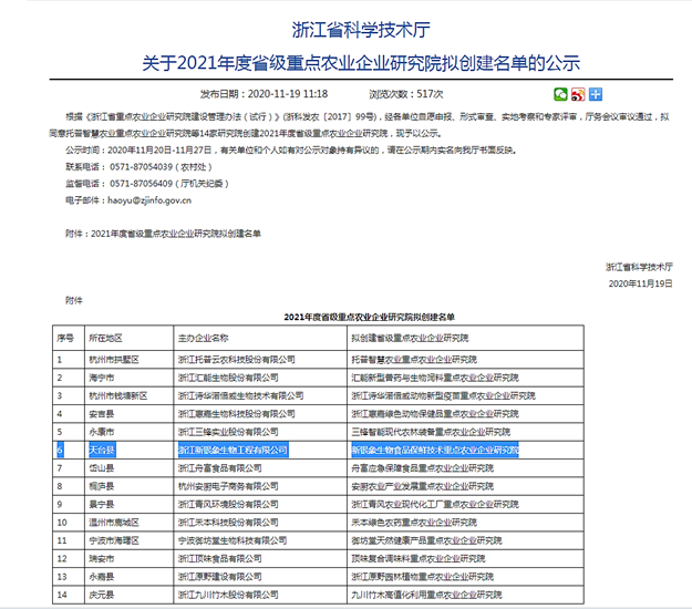 近日,浙江省科學(xué)技術(shù)廳2021年度省級(jí)重點(diǎn)農(nóng)業(yè)企業(yè)研究院擬創(chuàng)建名單出爐,新銀象公司榜上有名,為14家擬創(chuàng)建企業(yè)的其中一家。據(jù)悉,“新銀象生物食品保鮮技術(shù)重點(diǎn)農(nóng)業(yè)企業(yè)研究院”是天臺(tái)縣“首家”省級(jí)重點(diǎn)農(nóng)業(yè)企業(yè)研究院,也是今年臺(tái)州市唯一獲創(chuàng)建的企業(yè)。